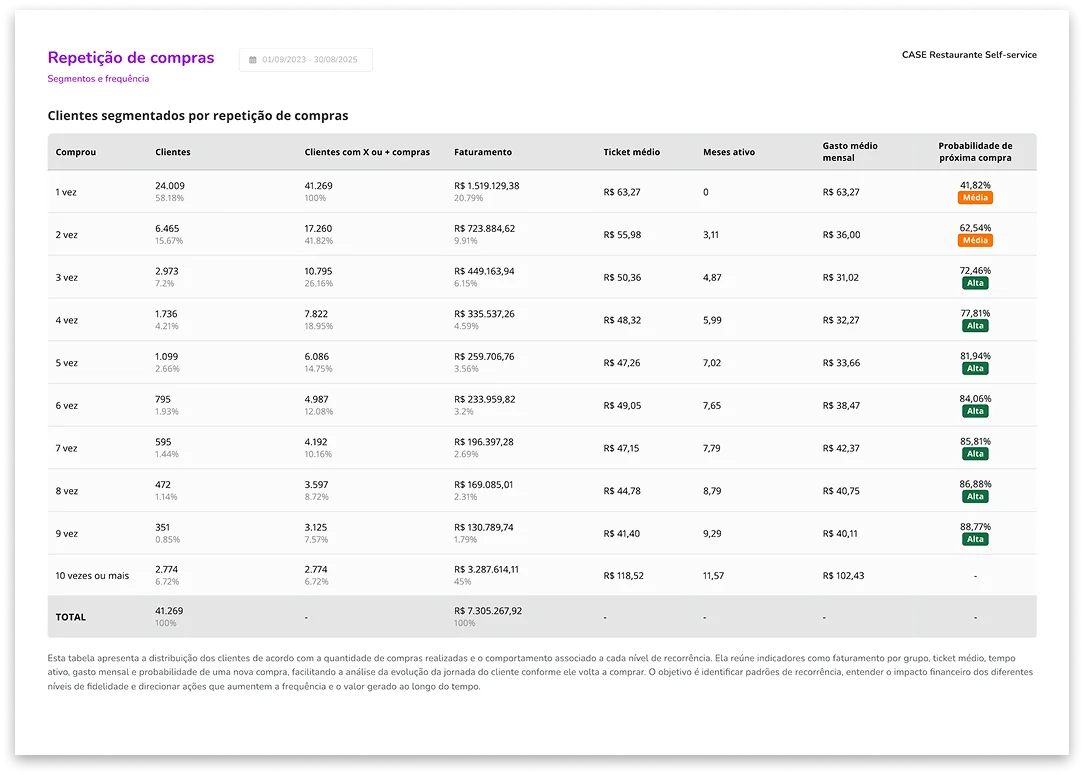 Seus clientes serão organizados em grupos com comportamentos parecidos, mostrando quem compra mais, compra pouco, está prestes a sumir e já foi perdido. Você vai enxergar padrões que hoje estão invisíveis.
