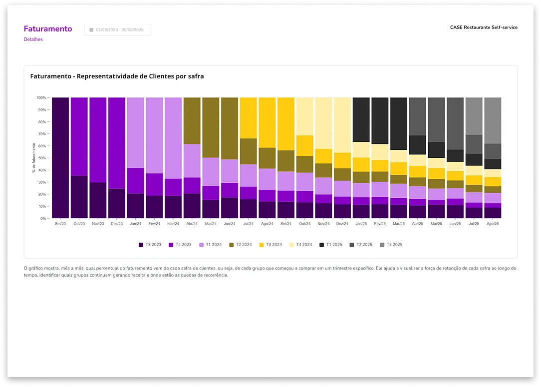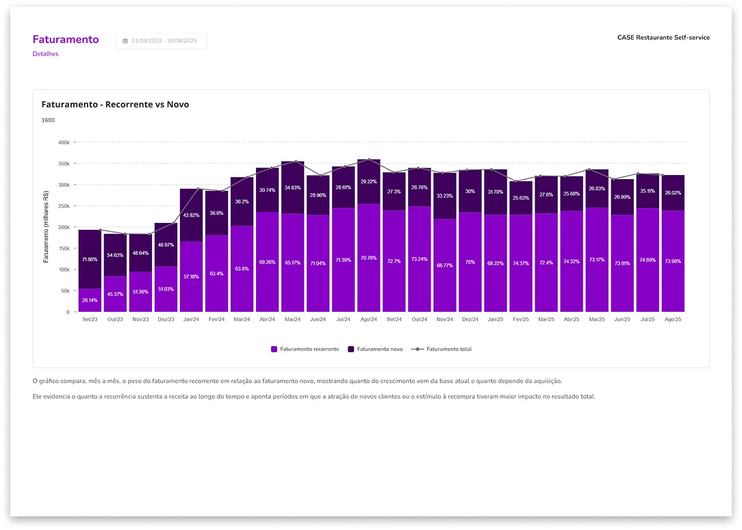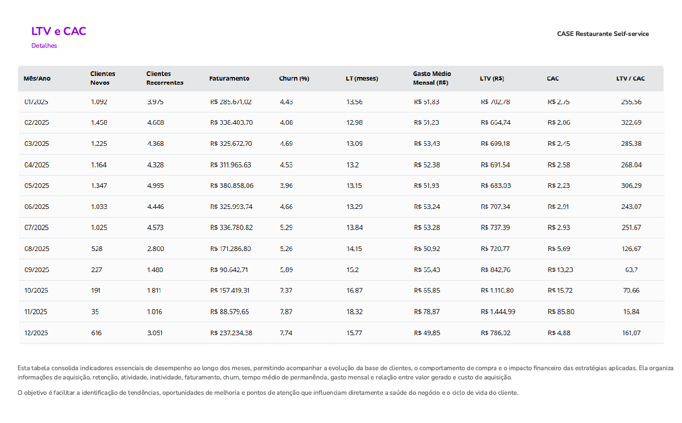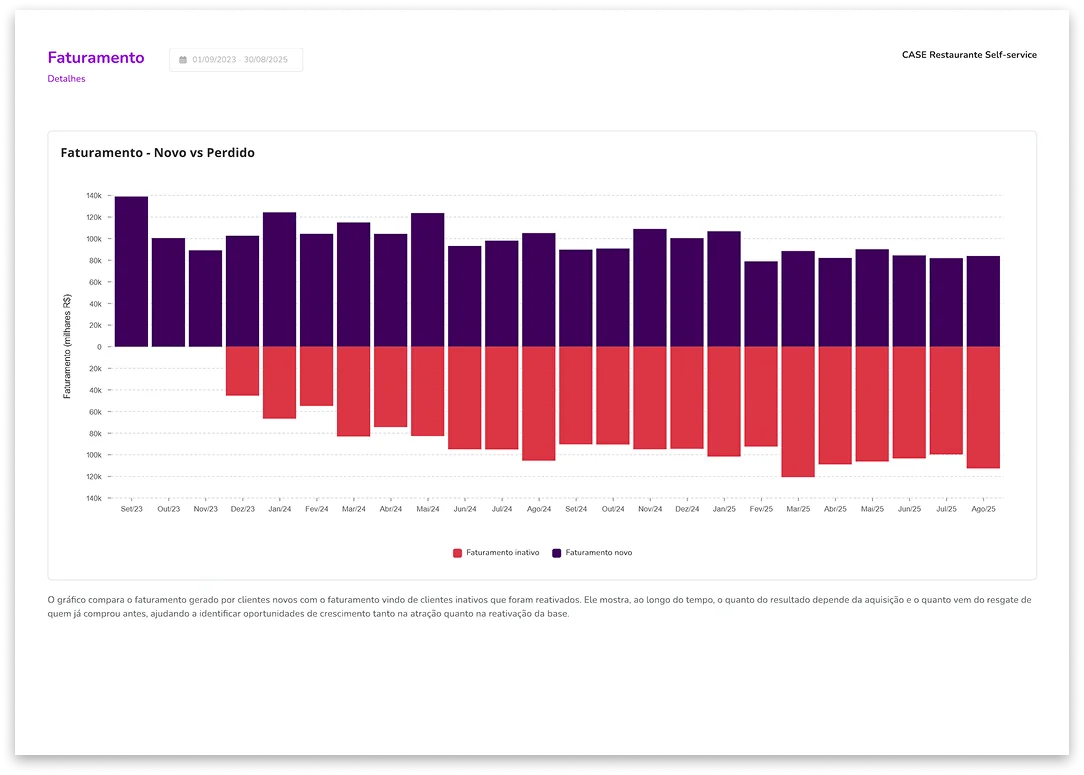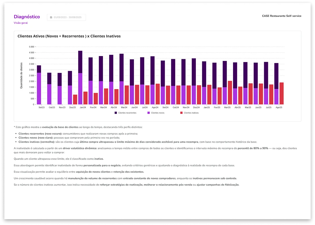 Você vai receber um diagnóstico com o fluxo de clientes novos, recorrentes e inativos mês a mês, para entender exatamente como sua base está se comportando.